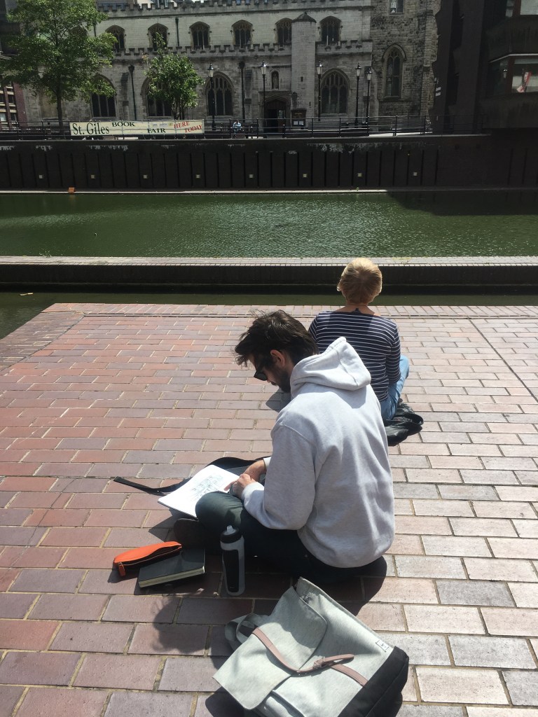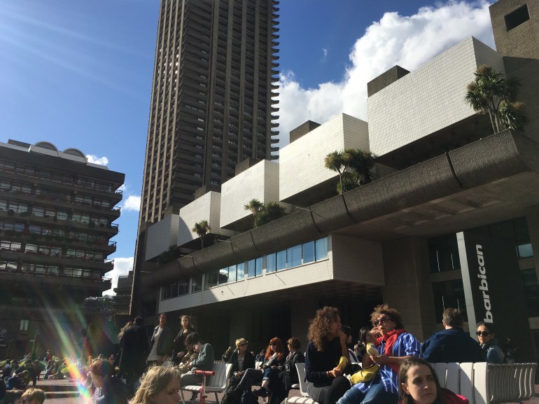 From our spot on the terrace (with the occasional glimpse of sunshine!), we were by no means in short supply of interesting subject matter. A constantly shifting mix of people was set against a varied backdrop of natural forms and architectural compositions. (Even if you’re not a fan of Brutalism, there are views of St Giles Cripplegate church across the lake).