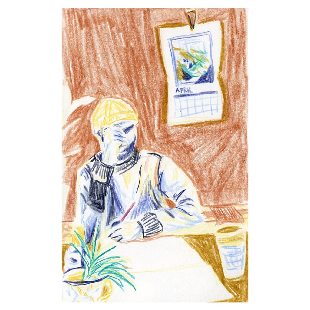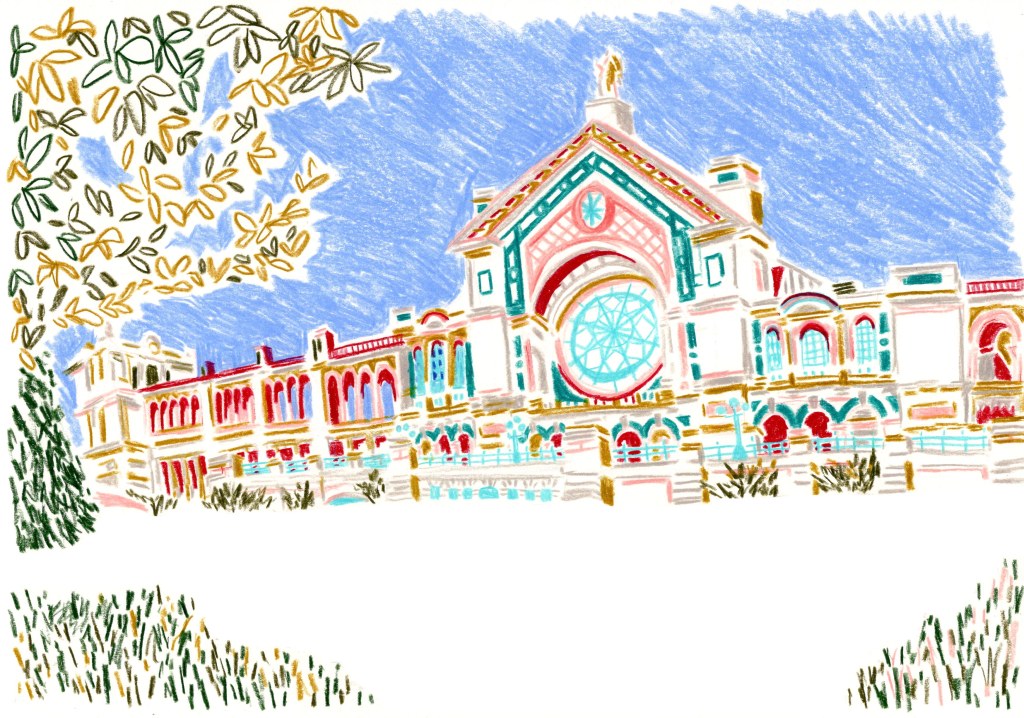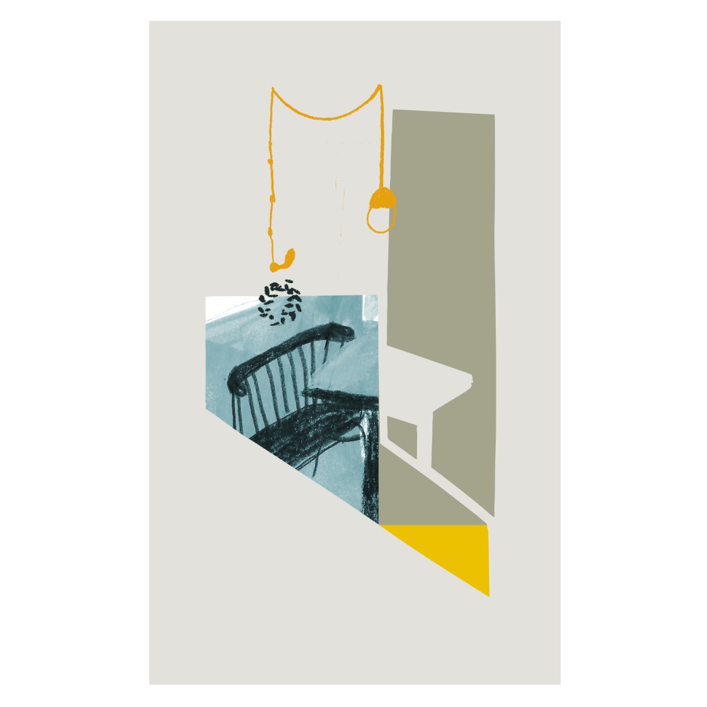 This illustration is the most abstract within the exhibition, and expresses my passion for collage and simplifying scenes down to their essential elements. It speaks of a process whereby I take a drawing from life, and distill it down to colour, shape, texture and line, to convey my impressions of the scene. From the original study, made at Luminary Bakery in Stoke Newington, I desired to communicate its sense of warmth and familiarity in a calming and quiet way. The result is not open-ended, nor closed, but instead speaks of a journey, of possibility, and of a desire to keep exploring our vibrant and constantly evolving landscape we live in, and developing new methods to relay it onto the page.