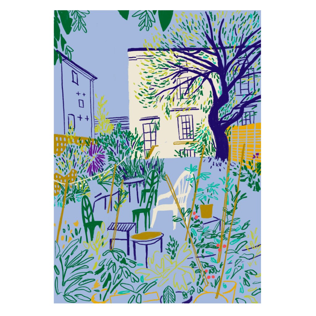 The scene depicts a back garden in Archway, which belongs to some friends of mine who originally commissioned the artwork. They have done wonderful things to the garden, and I have spent many summer days and evenings there, so I think of it fondly. I wished to emphasise the growing plants in the foreground, mirrored by the leaves that subtly frame the image at the top, whilst the garden furniture hints at the presence of people and life, as I know it to be a garden that is used and cherished, designed yet left to nature, and full of memories, love and labour.