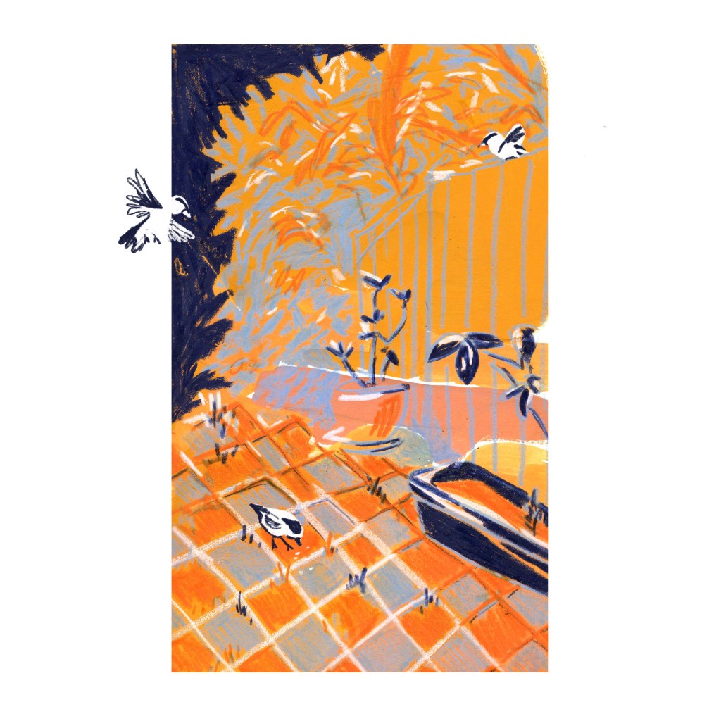 This illustration started life as a gouache painted background in fiery orange, on top of which I drew a scene in my garden, bringing the colour through in the terracotta floor tiles and plant pots. The birds in white complete the composition, and reflect the appreciation I have developed for my local wildlife during the lockdown. There is a texture to the original which is captured by the print, whilst making it possible for the birds, which contrast to the oranges and blues in their brilliant white, to cheerfully steal the show.