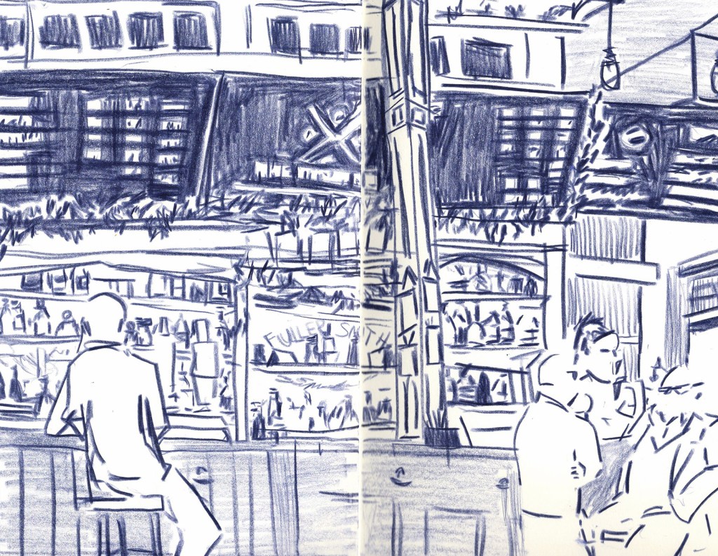 This piece, with its central seam, was originally drawn in a sketchbook at a pub in Shoreditch, during an era before Covid-19. It depicts a pub interior with people interacting at the bar, drawn with an energy and sense of purpose. While being a study from life, it captures the scene in a balance of realistic detail and intriguing vagueness which invites the viewer to complete the picture, and reflect onto it their own memories and desires.