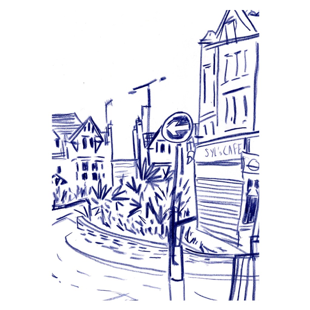 This is the most recent drawing on display, and was made from life while sitting at a public bench. I included this piece to give the viewer an insight into my sketchbook process, and also mark myself as a proud Haringey local, as the junction marks where Crouch End, Alexandra Palace and Muswell Hill meet. I would not deem the location as instantly recognisable, nor necessarily that well-loved by locals. However, it is well traversed and unassuming, which is the typical type of scene captured on the pages of my sketchbook.