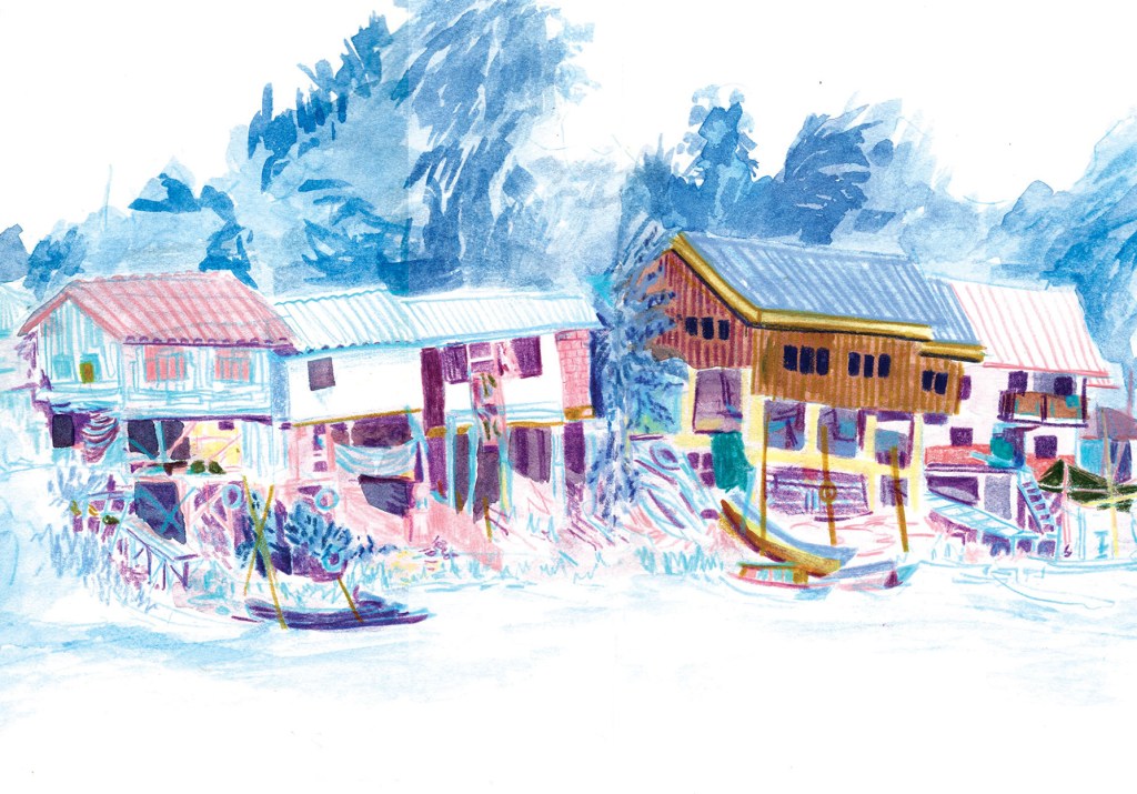 This piece was created over the span of a couple of hours, while sitting at a cafe overlooking the Chao Phraya River in Ayutthaya, Thailand. It bears the hallmarks of a drawing created from life, with a slightly ‘rough-and-ready’ quality of line, and the central seam from having been drawn across two pages in a sketchbook. None-the-less, these qualities give it a energetic charm all of its own, capturing a time and a place in the way a good drawing should do. As you scan over the drawing, areas come in and out of focus, colours and textures connect and reamerge across the piece. It is figurative, yet abstract, and invites the viewer to explore and experience the scene with their own eyes.