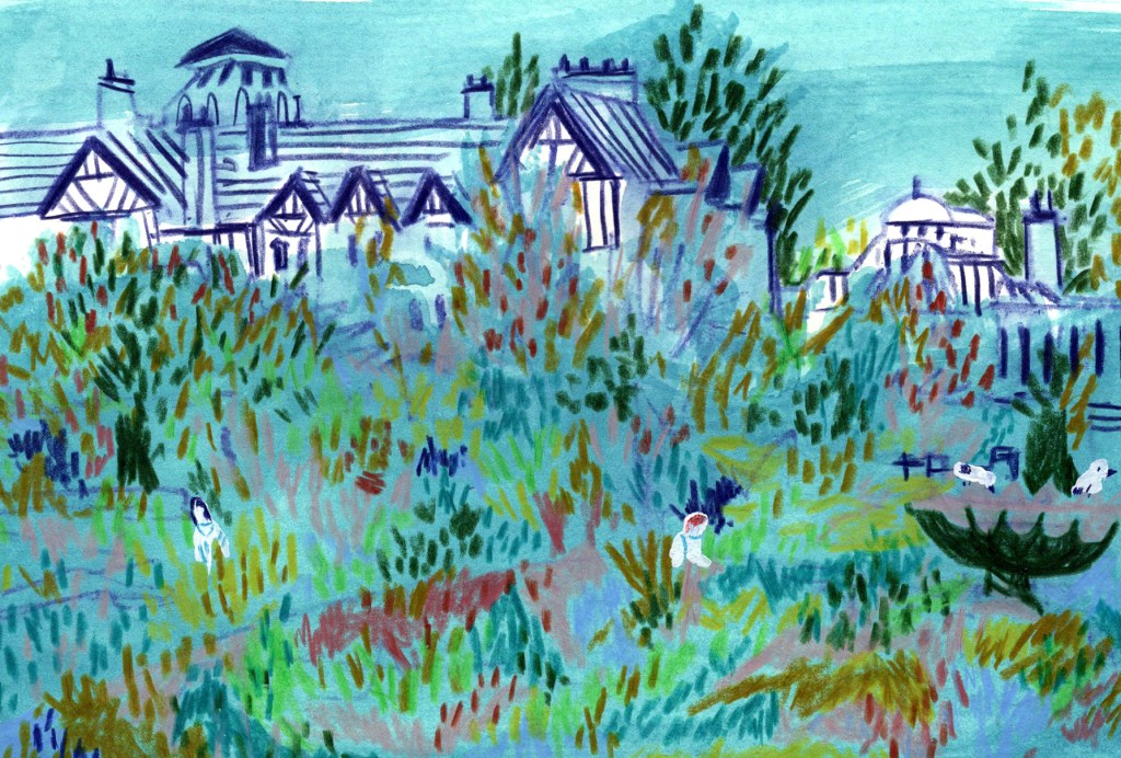 This developed from a study I did at Bodnant Gardens, a National Trust site near Conway, Wales. The study was made in dark blue pencil, which you can still see as the house, then the green watercolour wash, textural pencil marks and figures in white paint were added later, working from a film photograph I took of the scene. The colours deviate from life, and stand quite saturated, while the sky shares the same teal hue as the shrubbery below. The title, Secret Garden, refers to the sense of quiet within the scene, the figures and birds are at one with the plants and flowers. They stand out, painted in white, to highlight how they, like myself as a visitor, are overshadowed by, and in awe of, the abundance of their surroundings.