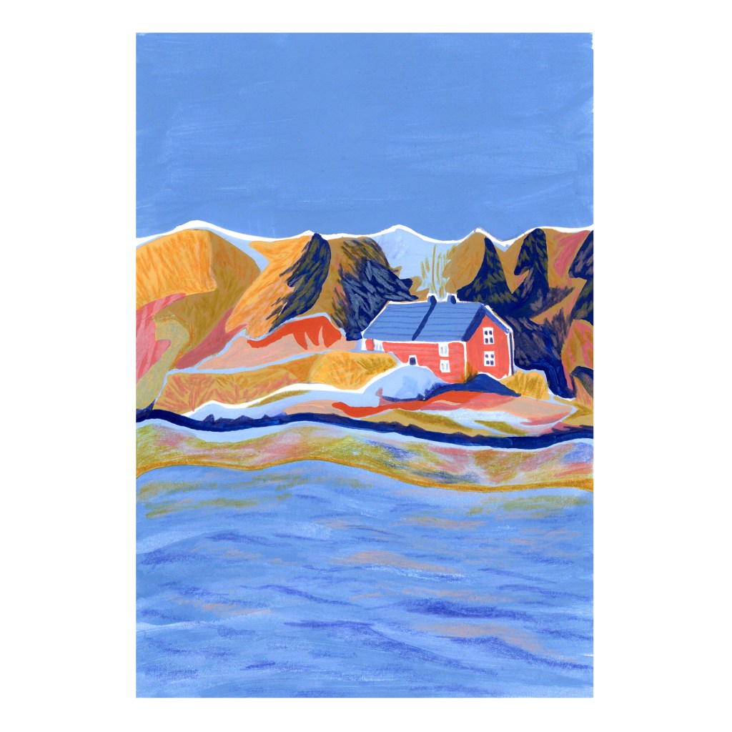 To the right, we find ‘Red Cabin, Stockholm’, which is a Giclée print of a painting I made from a film photograph I took on a boat tour of the Stockholm archipelago. It is instantly recognisable as a Scandinavien scene, thanks to the distinct red and white wooden cabin, complemented by a limited colour palette. Like many of my landscapes, I was drawn to the singularity of the house, against a textural background. The piece balances realism with abstract textures and marks, which is particularly noticeable in the reflection on the water and shaded clusters of trees.